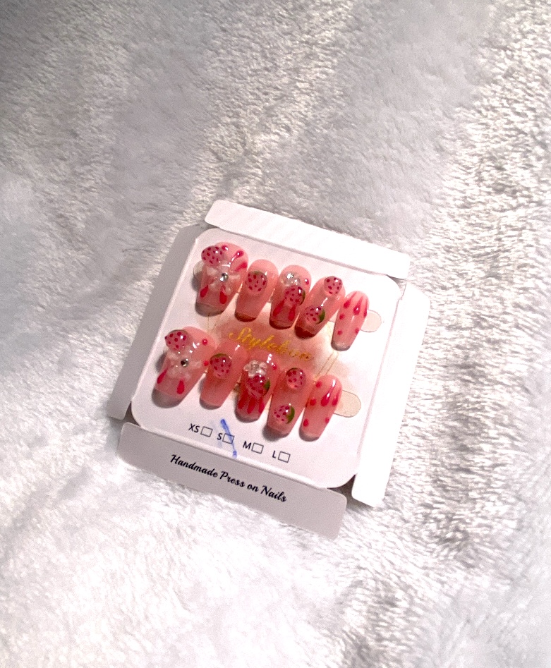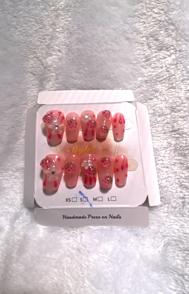 Uñas press on rosas claro, con diseño de fresa 3D.