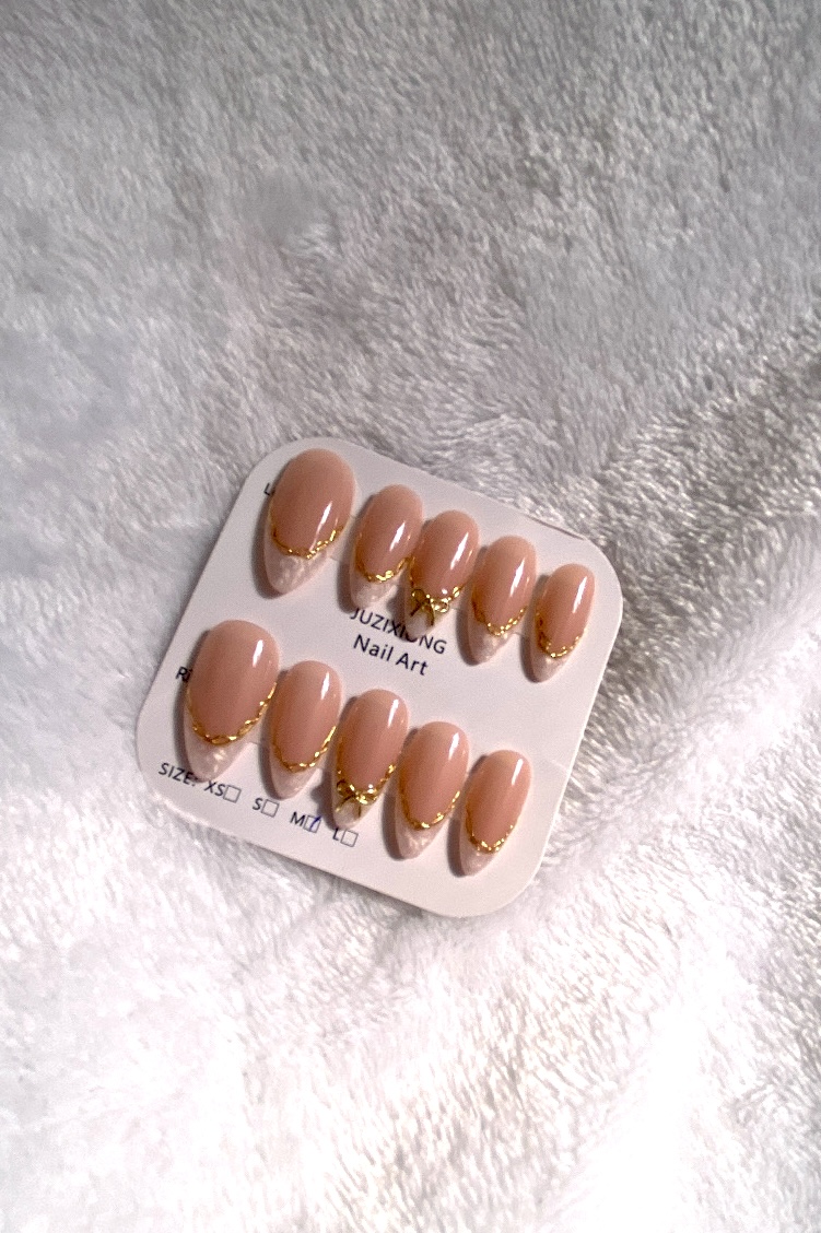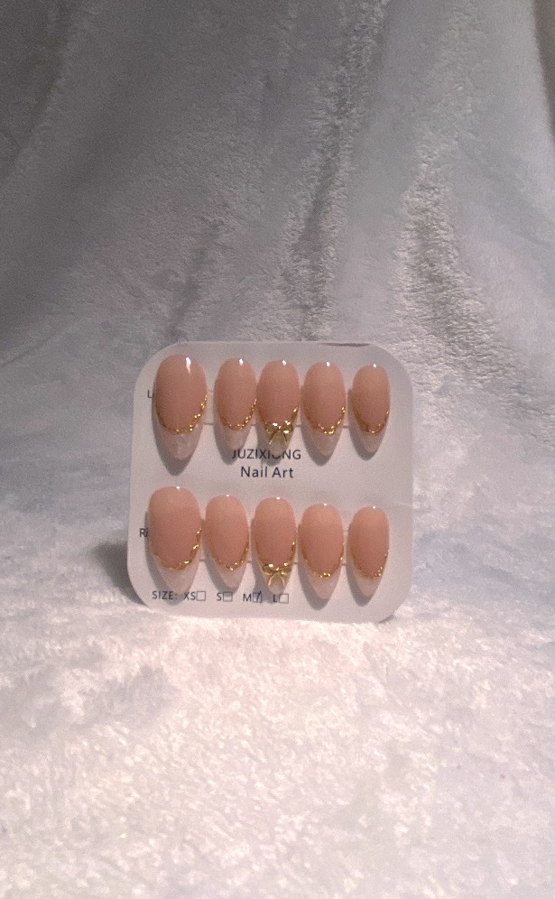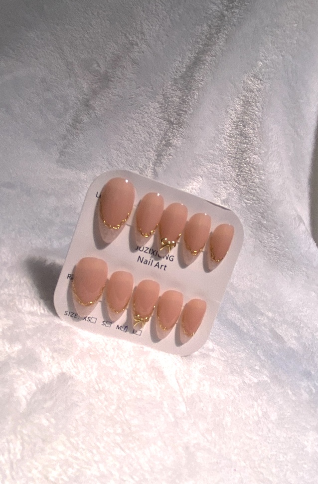 Uñas press on rosa, estilo french rosa plateado con moño dorado.