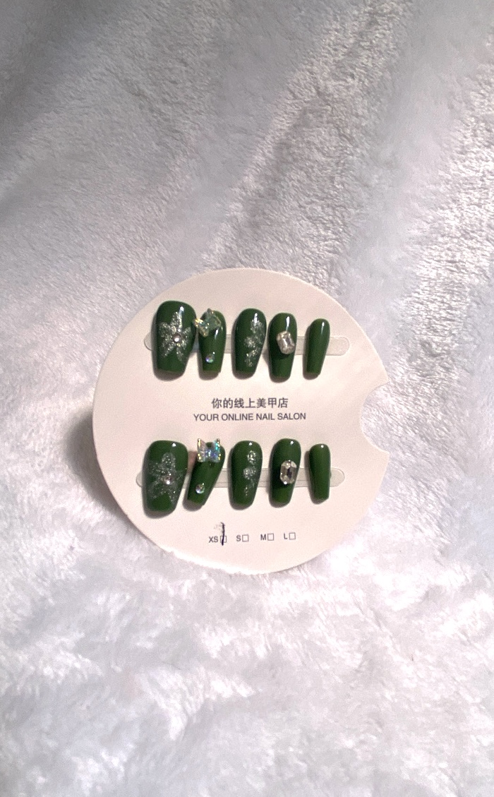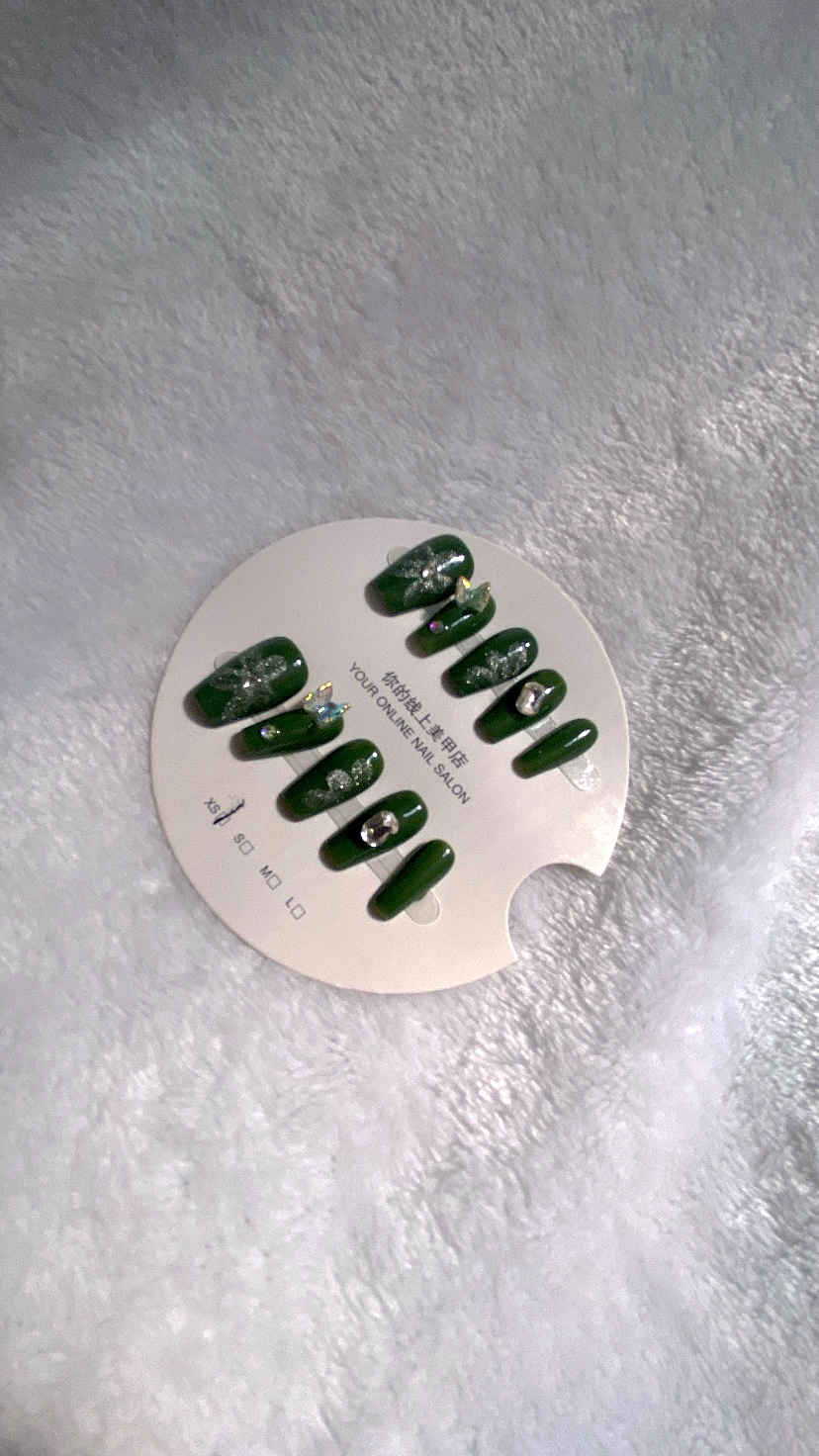 Uñas press on verde con mariposas, flores y perlas.