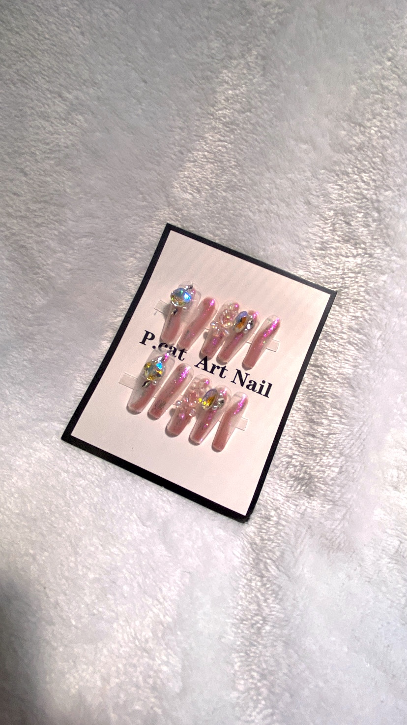 Uñas press on blanco y rosa brillante, con flores y diamantes.
