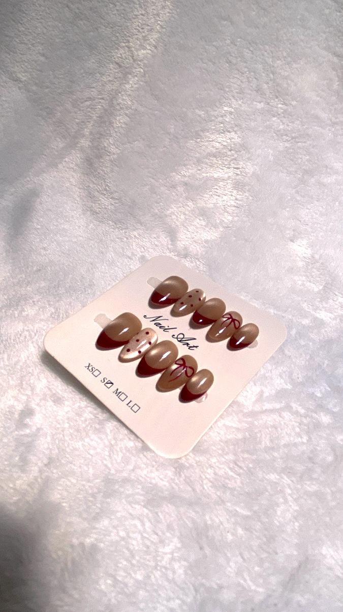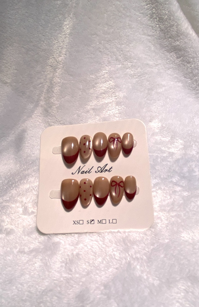 Uñas press on beige, french rojo con puntos y moños.